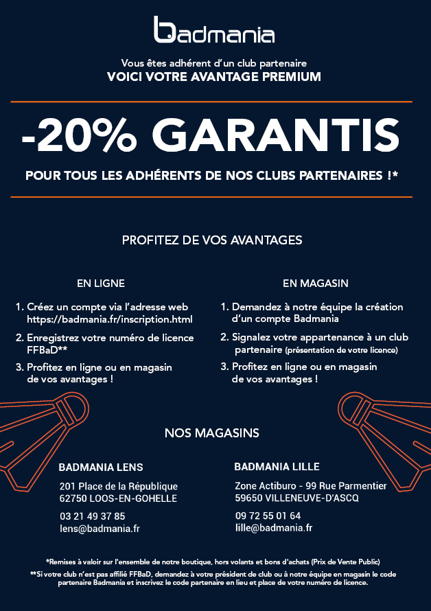 👉 Grâce à ce partenariat, les adhérents du club bénéficient d’avantages exclusifs pour leurs achats Badmania